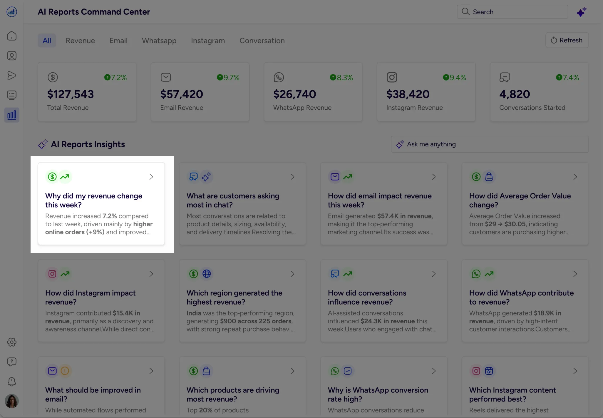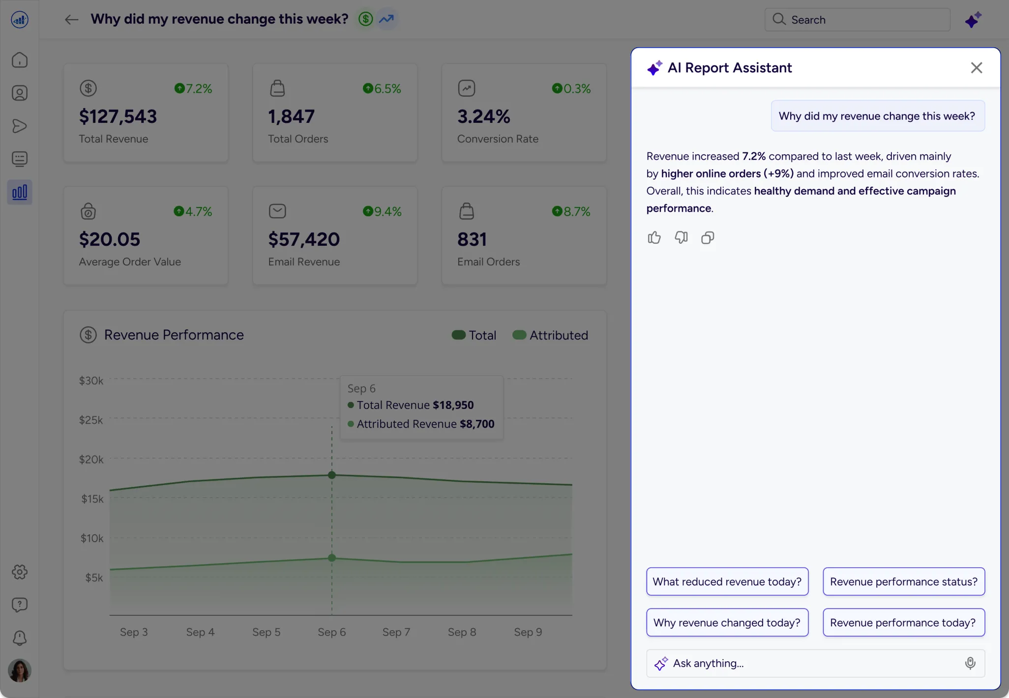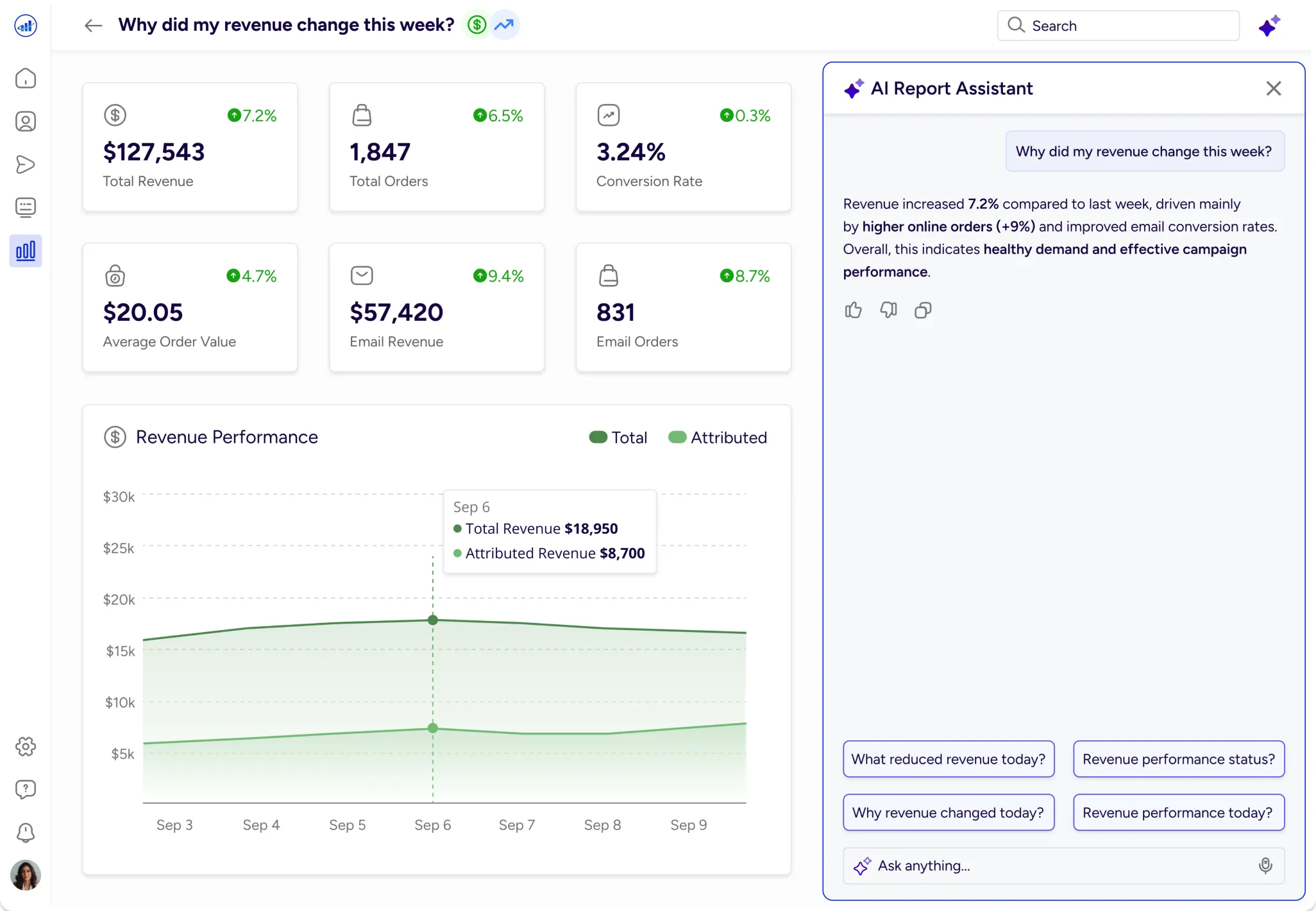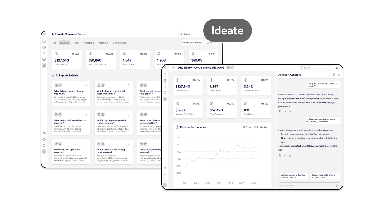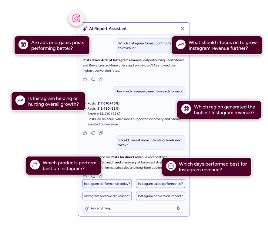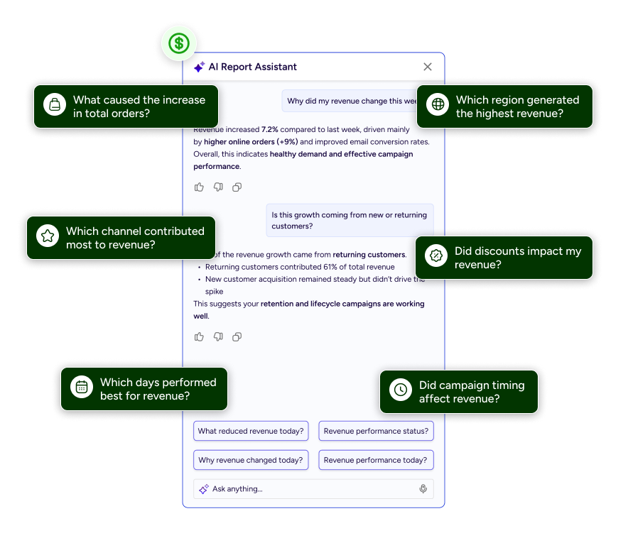 Gives an instant snapshot of revenue, orders, and conversion trends, with AI explaining why performance changed.