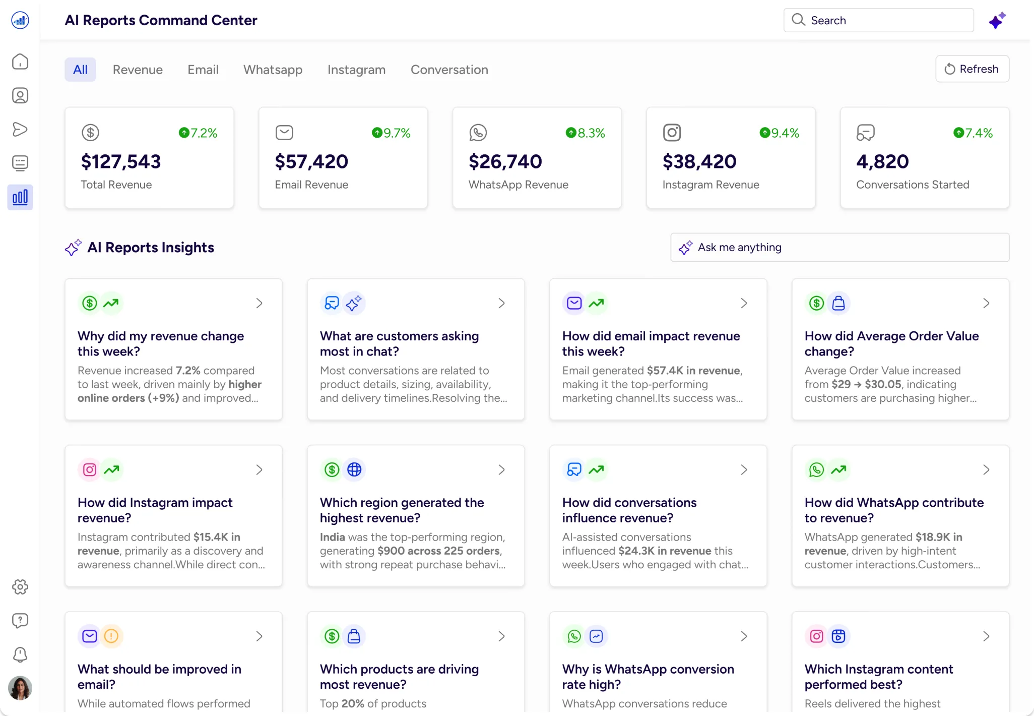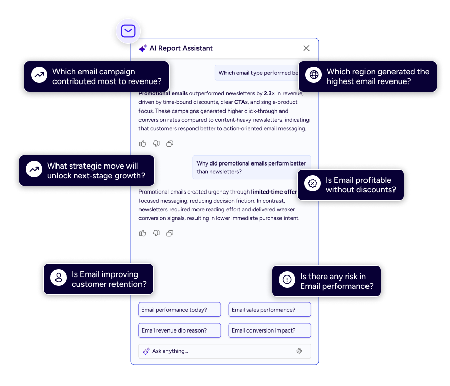 AI insight cards and a question‑based interaction model help teams quickly prioritize and act on revenue‑impacting metrics with clarity and confidence.