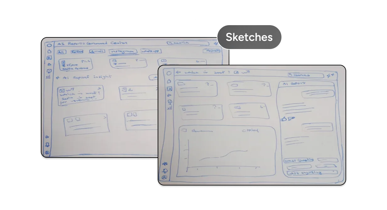 Using insights from competitor analysis and common report workflows, I created rough hand‑drawn sketches to explore layout ideas, information hierarchy, and AI‑driven insight placement. At this stage, the focus was on identifying what information and AI insights matter most to users not visual polish.